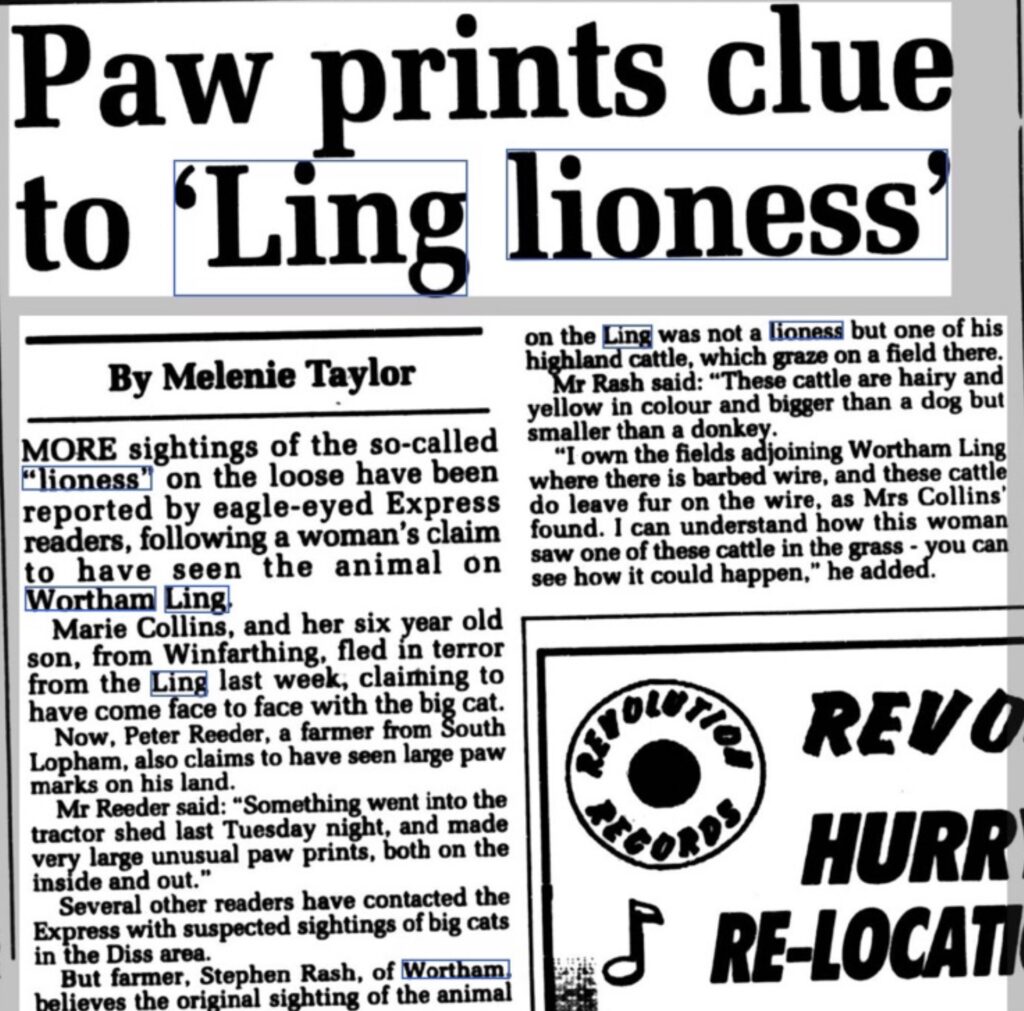 Diss Express journalist Melanie Taylor followed up with another article on 23 August 1996, “Paw prints clue to ‘Ling lioness’”. Peter Reader, a farmer from nearby South Lopham, claimed to have seen “large paw marks on his land” subsequent to the Collins’s sighting. Something had gone into the tractor shed and made “very large unusual paw prints, both inside and out.” Other readers had also since contacted the Express with “suspected sightings of big cats in the Diss area,” although no more detail was given.