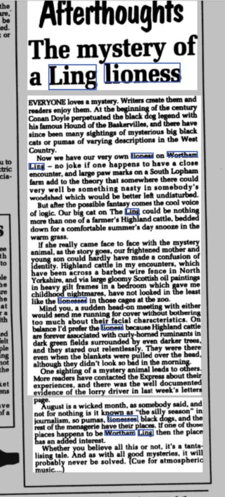 The “Afterthoughts” column of the Diss Express of 30th August 1996, “Kay Hunter’s Views on Country Life,” had the title “The mystery of a Ling lioness”. In a rather lame column that didn’t really come to any conclusions, Hunter agreed that it would be hard to misidentify a Highland cow, but also expressed the opinion that “August is a wicked month” and made hints about the “silly season.” She did refer, however, to more readers recently contacting the Express about their experiences” and “the well documented evidence of the lorry driver in last week’s letters page.”