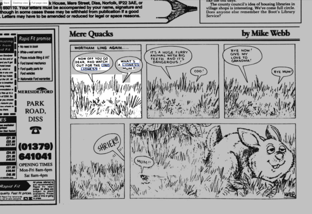 The Ling lioness was apparently still enough in people’s minds to be referenced in an equally lame Diss Express Mere Quacks cartoon strip by Mike Webb on 27 September 1996.